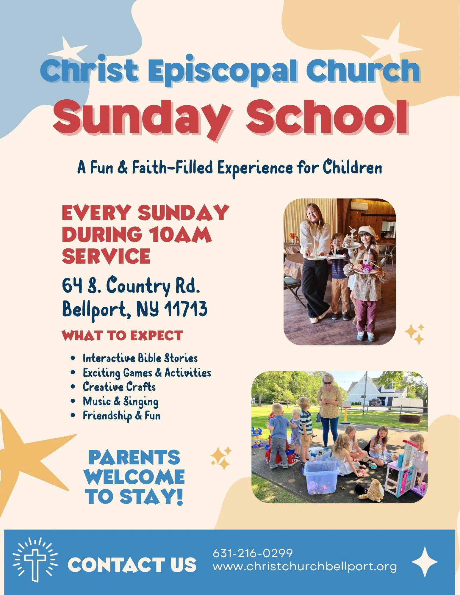 Christ Church Sunday School for kids meets weekly at 10 am- Rand Hall, south side of church building. Ages 3-4 and Pre-K through Elementary School.