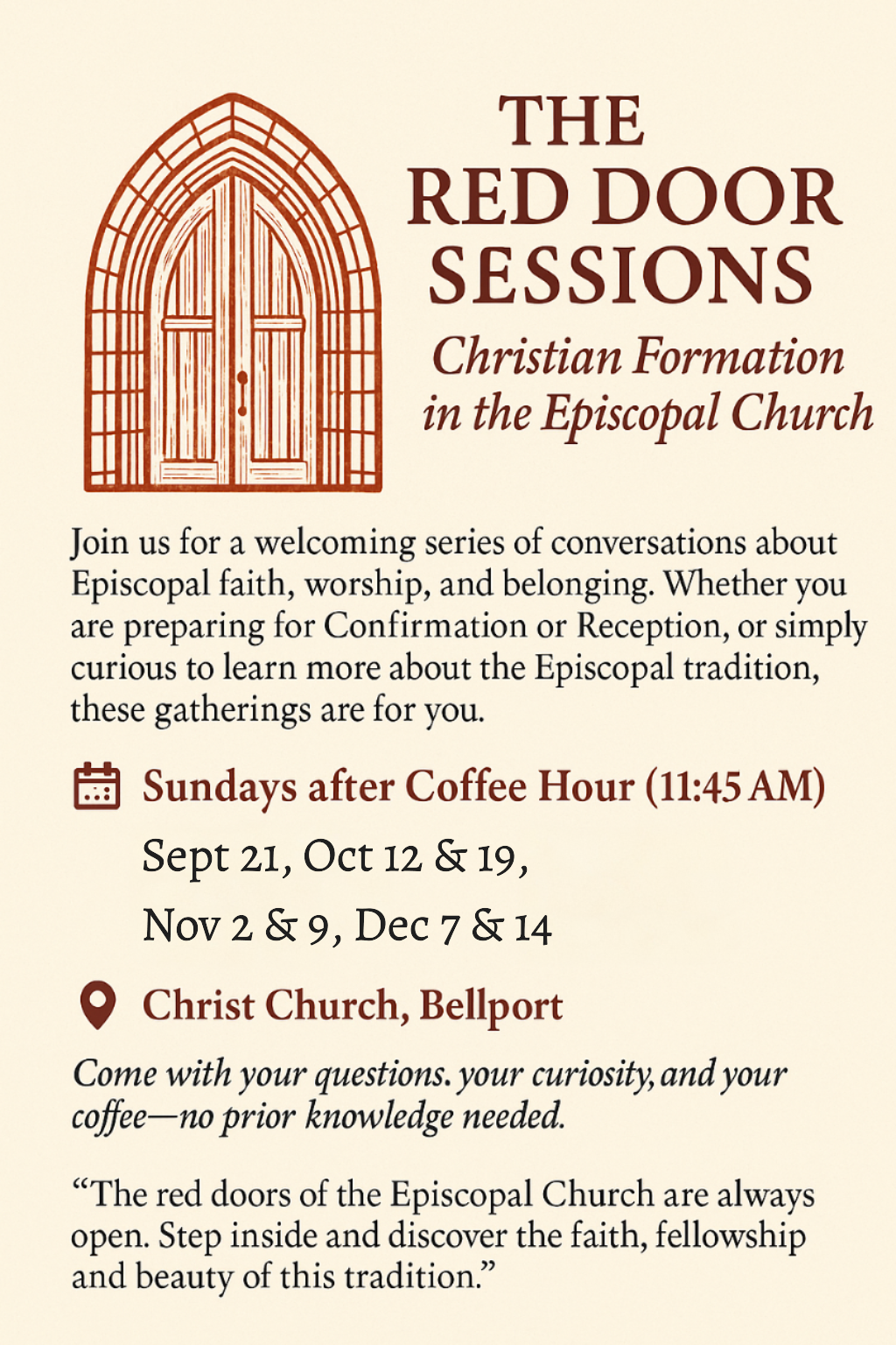 If you are curious about the Episcopal Church; if you’re seeking reception or confirmation, please join us Sunday (dates listed above) at 11:45 am in the conference room. Bring your coffee and “coffee hour treats.” Everyone is welcome!